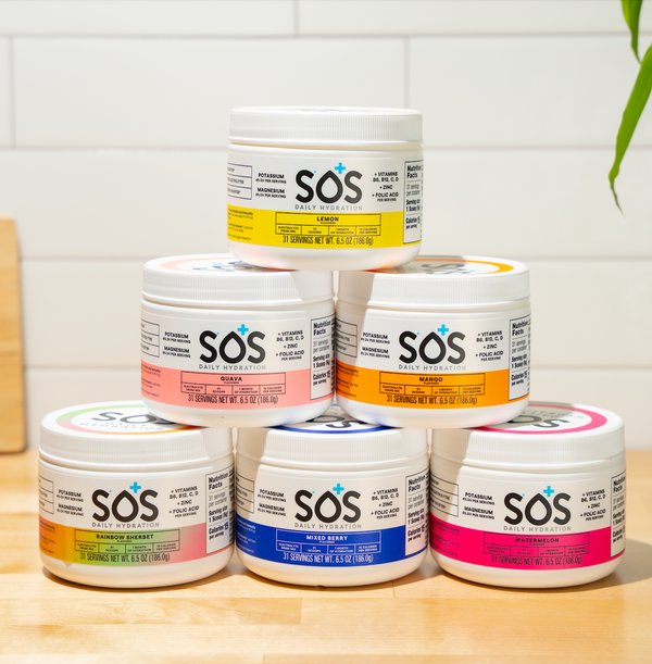 SOS is an advanced and proprietary “oral rehydration solution” - a long phrase for a scientific solution with the right balance of sodium and electrolytes. We balance molecules of sugar to sodium to ensure rapid hydration – up to 4x faster than plain ole water. Instead of sugar-heavy sports drinks or standard sodium-based electrolytes, we use science to get the best of both. In short, SOS makes your water work faster and has happy electrolytes to make your cells function.